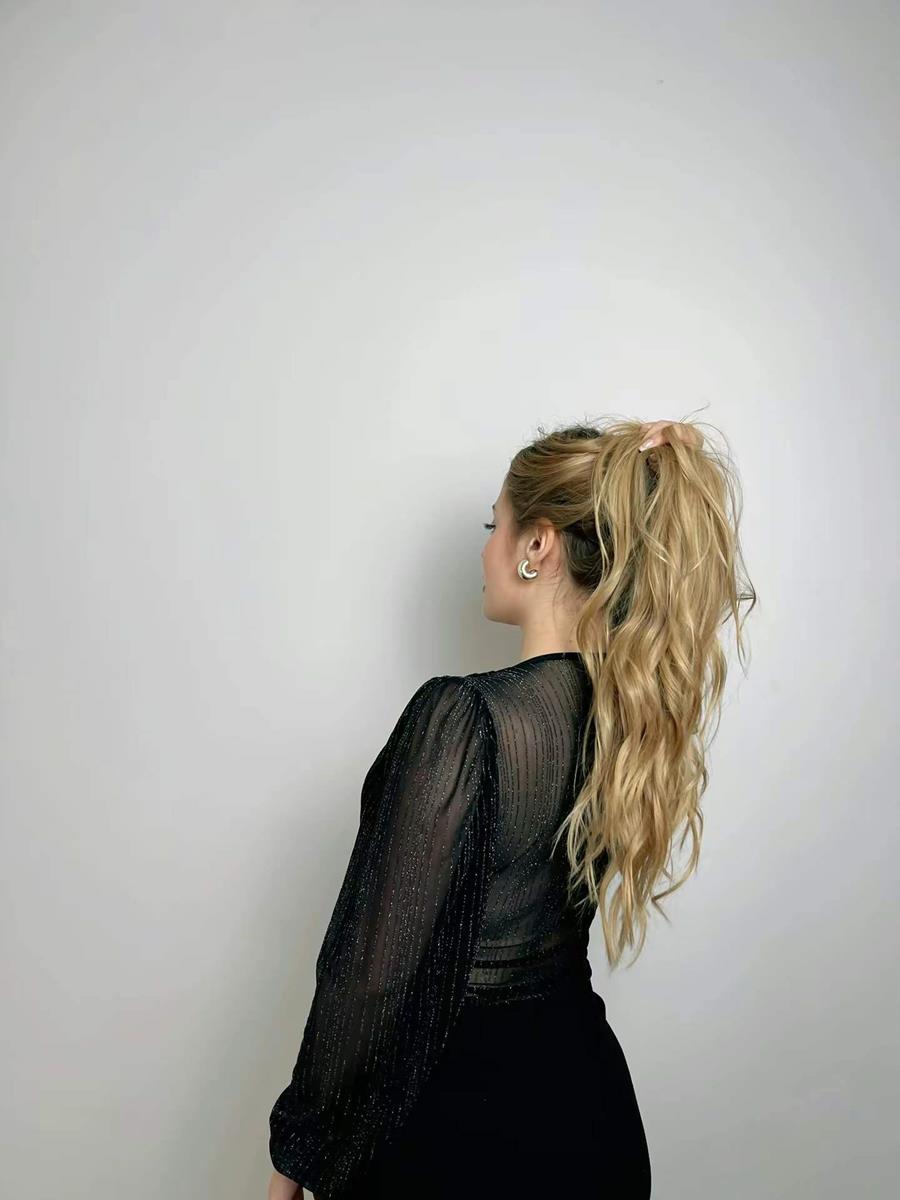 Body de tule com linhas prateadas, manga longa e transparência nas costas e mangas.