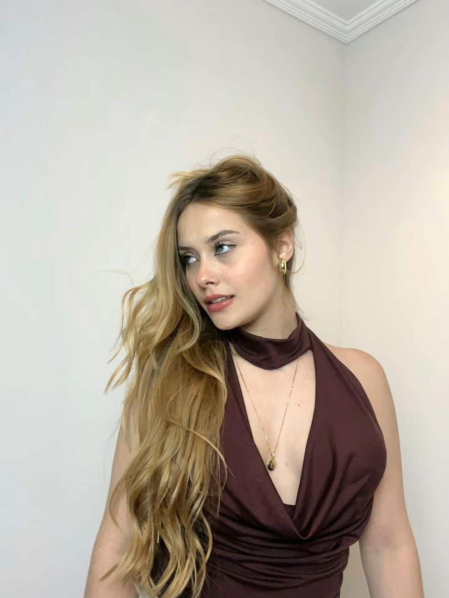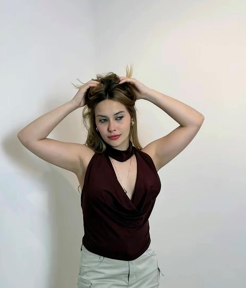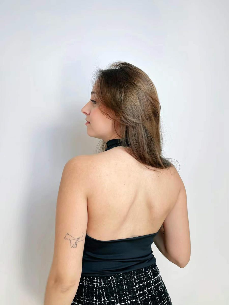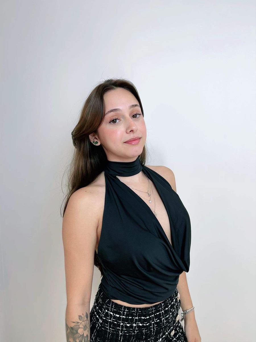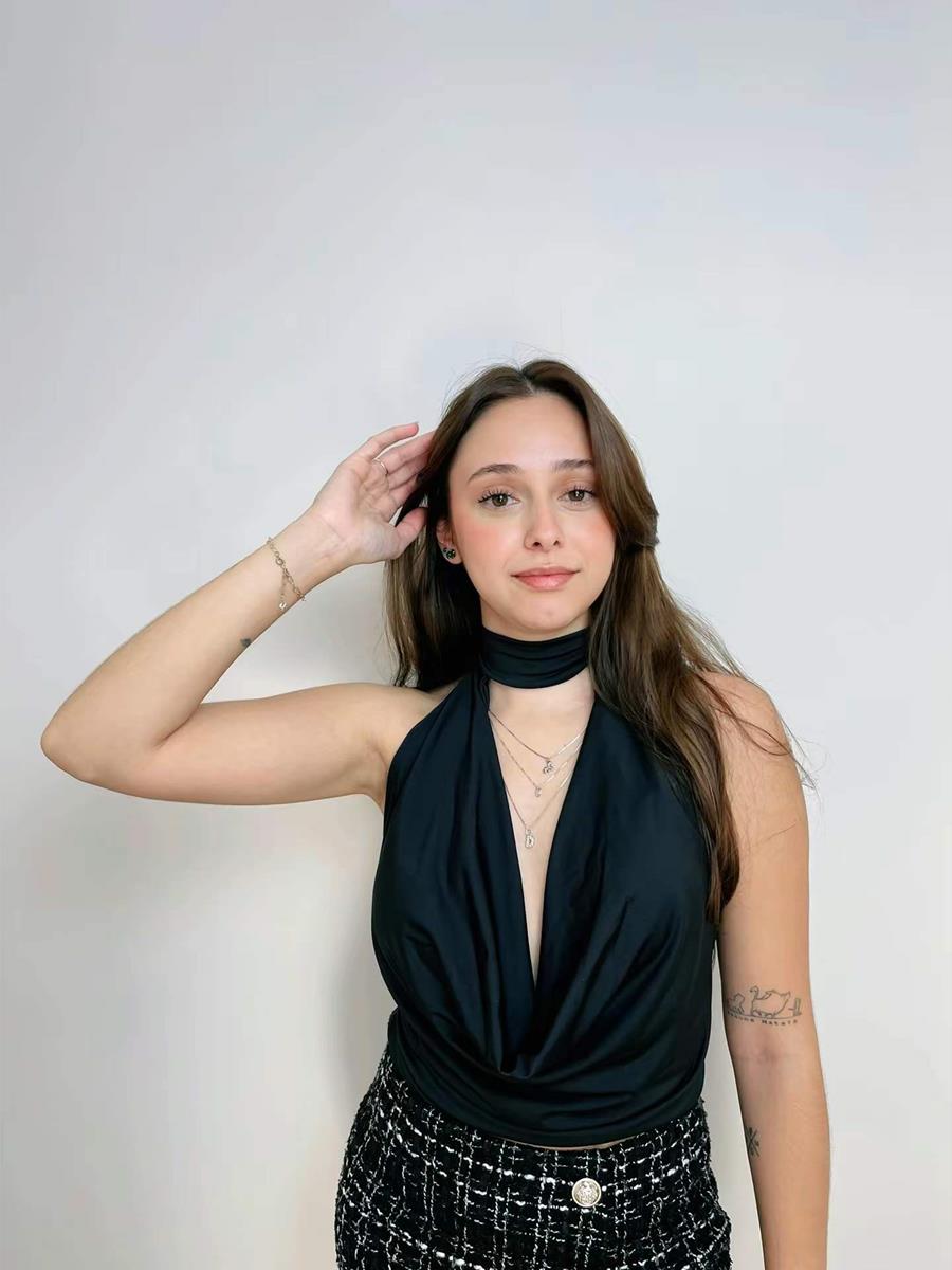 Cropped em poliamida fina com choker, caimento despojado na parte frontal e costas meio nuas.